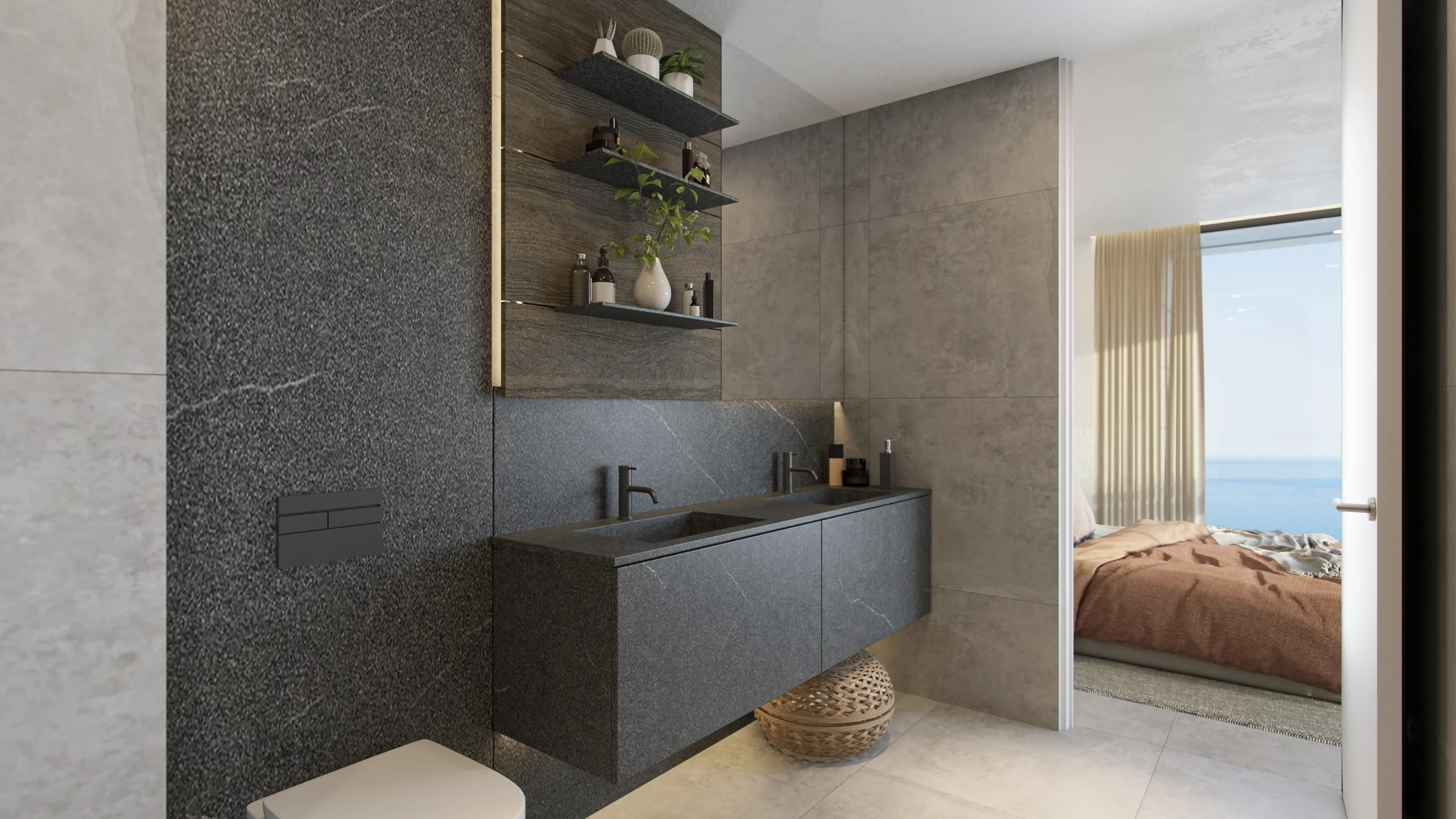 Comprend des appareils sanitaires suspendus haut de gamme avec des systèmes de contrôle sophistiqués pour l’hygiène et la commodité.